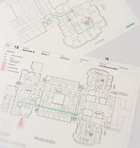 Wir fertigen Feuerwehrlaufkarten nach DIN 14675 und in Abstimmung mit der örtlichen Feuerwehr bzw. der zuständigen Brandschutzdienststelle. Nach Abschluss unserer Arbeiten übergeben wir Ihnen die Pläne in den gewünschten Formaten, ausgedruckt und laminiert auf Papier oder platzsparend auf Polyesterfolie Die Reiter zur Kennzeichnung der Meldergruppe der entsprechenden Karte können wahlweise aufgesetzt oder integriert werden.
